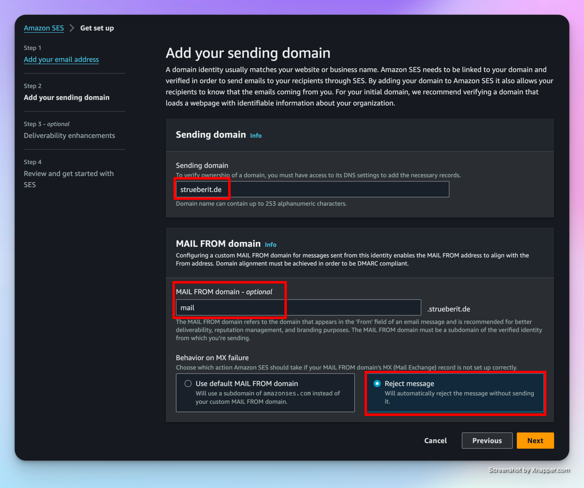 Now you need to add your sending domain. For better deliverability, the service recommends defining a mail from domain that is a subdomain of your primary domain. In my case, I choose „mail“ as subdomain. In case of an MX error, we choose to reject the message: