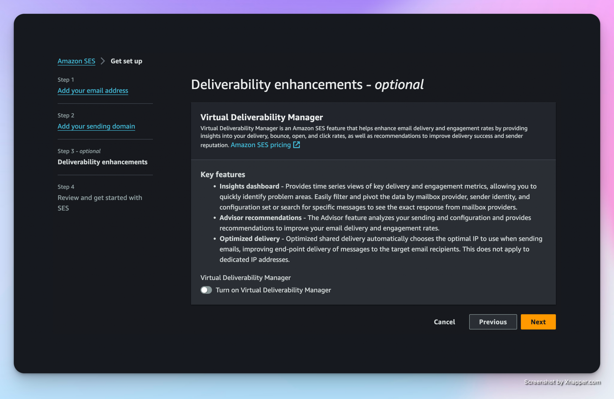 The virtual deliverability manager is a paid add-on service that we do not need: