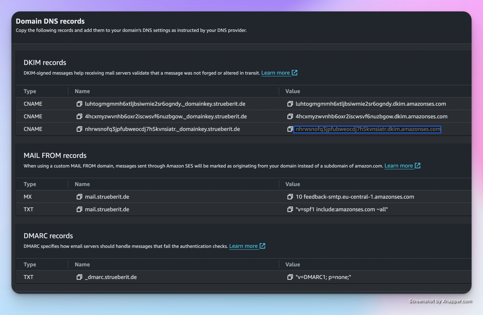 Now you need to set up your sending domain, so go to the Amazon SES service and click on „Get DNS Records“: