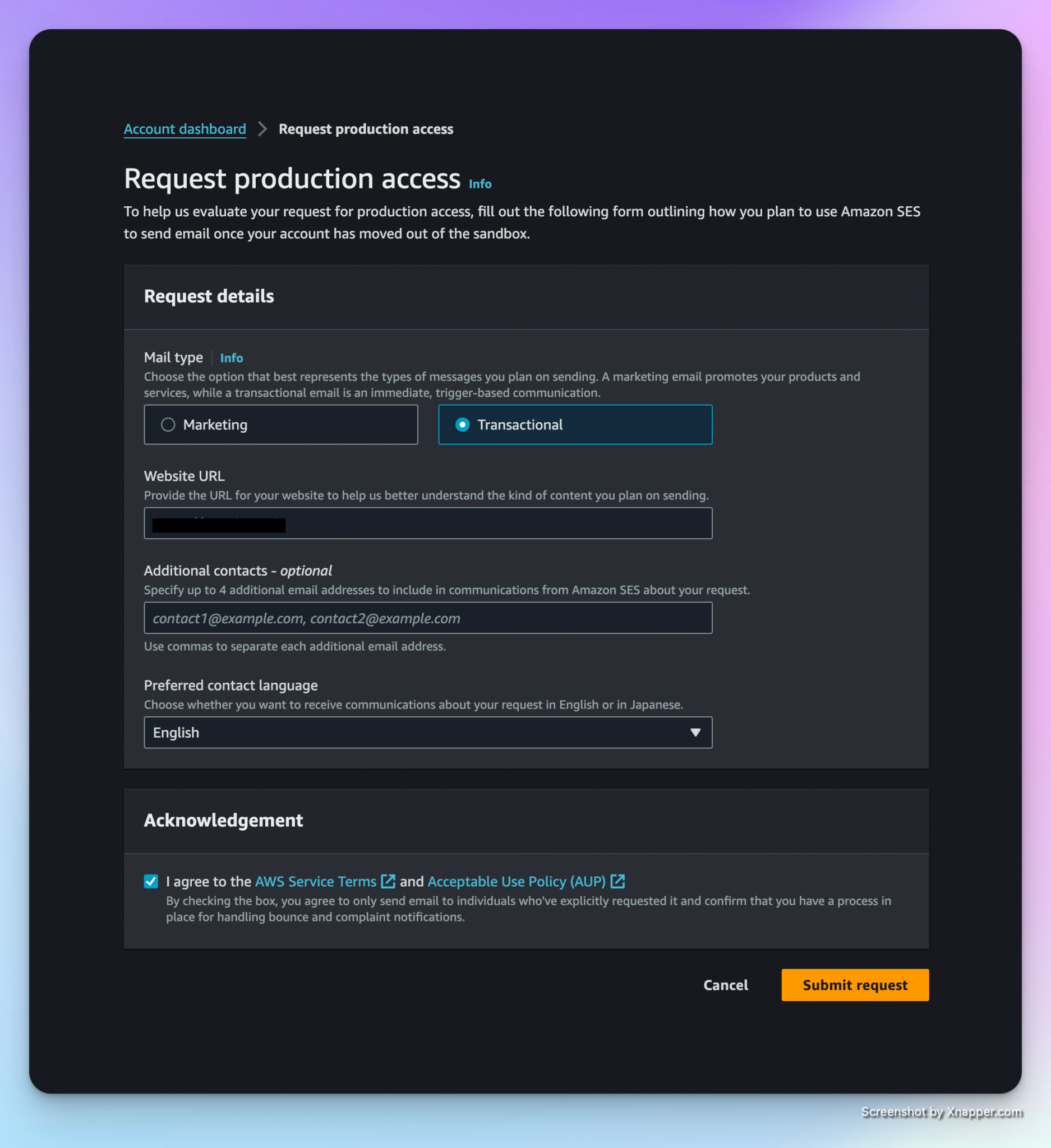Since the account is currently in the sandbox state, we need to request production access to remove the restrictions that are currently in place: