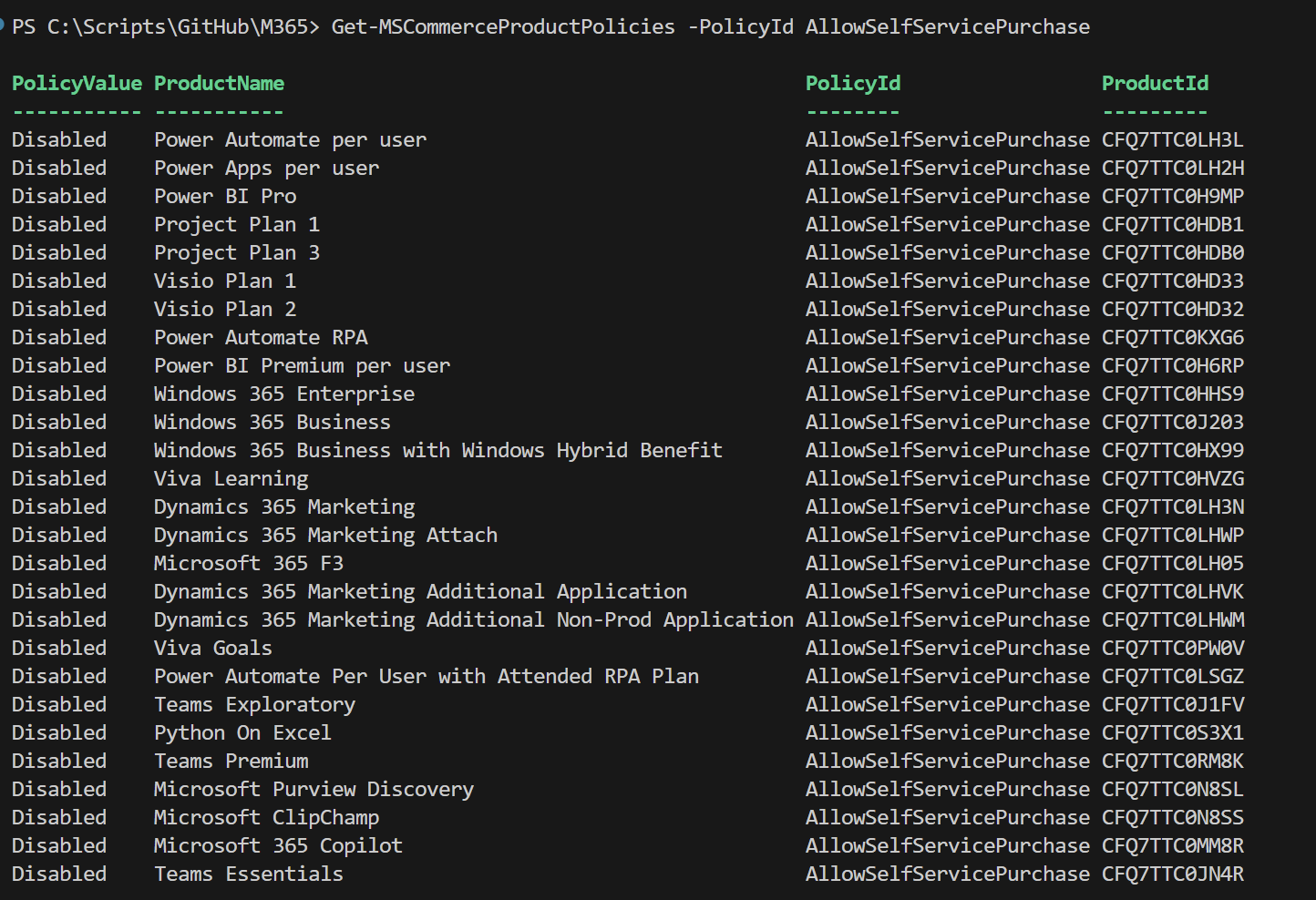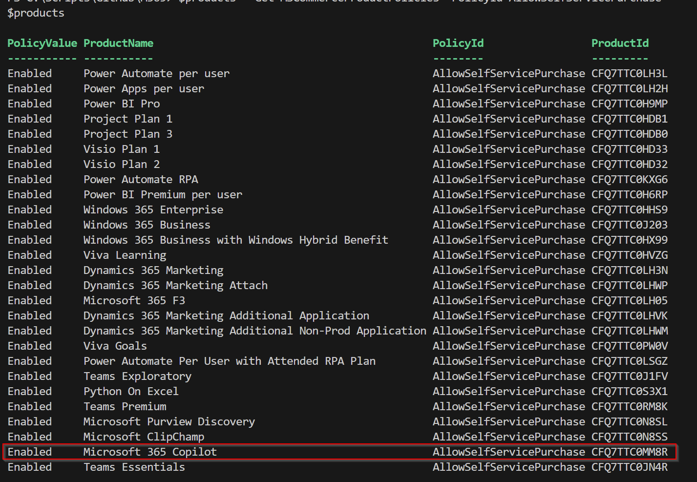 $products = Get-MSCommerceProductPolicies -PolicyId AllowSelfServicePurchase