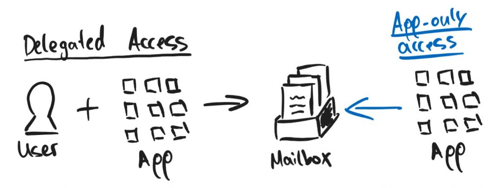 For accessing a mailbox through an application we basically differenciate between delegated access and app-only access. When using delegated access you „access the mailbox on behalf of a user“ so you need a real user with username & password to authenticate to. In addition due to security reasons you will also need to provide an additional factor for secure authentication (MFA with Authenticator for example). Because this is not suitable for an application that will run in the background we have the second option. That option is called app-only access! In this case the application can authenticate and interact with the mailbox with its own identity without a signed in user.