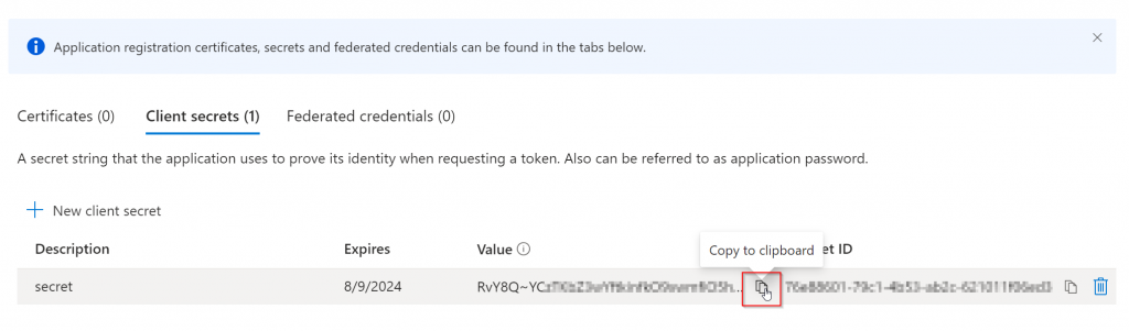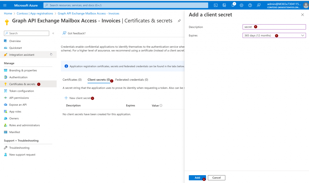 You can use either a certificate or a client secret to authenticate to the created application. For this test we will choose a client secret (because it is easier) but in a production environment it is recommended to go with a certificate because it is more secure!