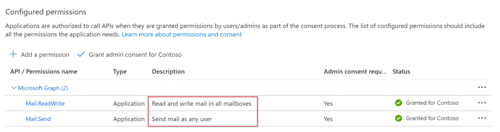 For the granted permissions to become active you must grant tenant-wide admin consent. This is due to the fact that the application will be able to interact with all mailboxes in the tenant. As we just want the application to interact with the Invoice mailbox we will later limit the permissions with an Application Access Policy in Exchange Online.