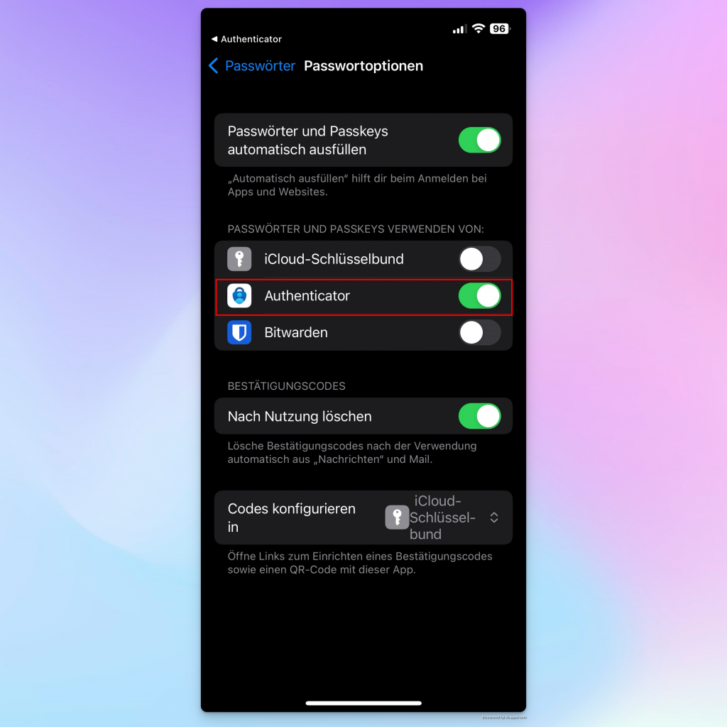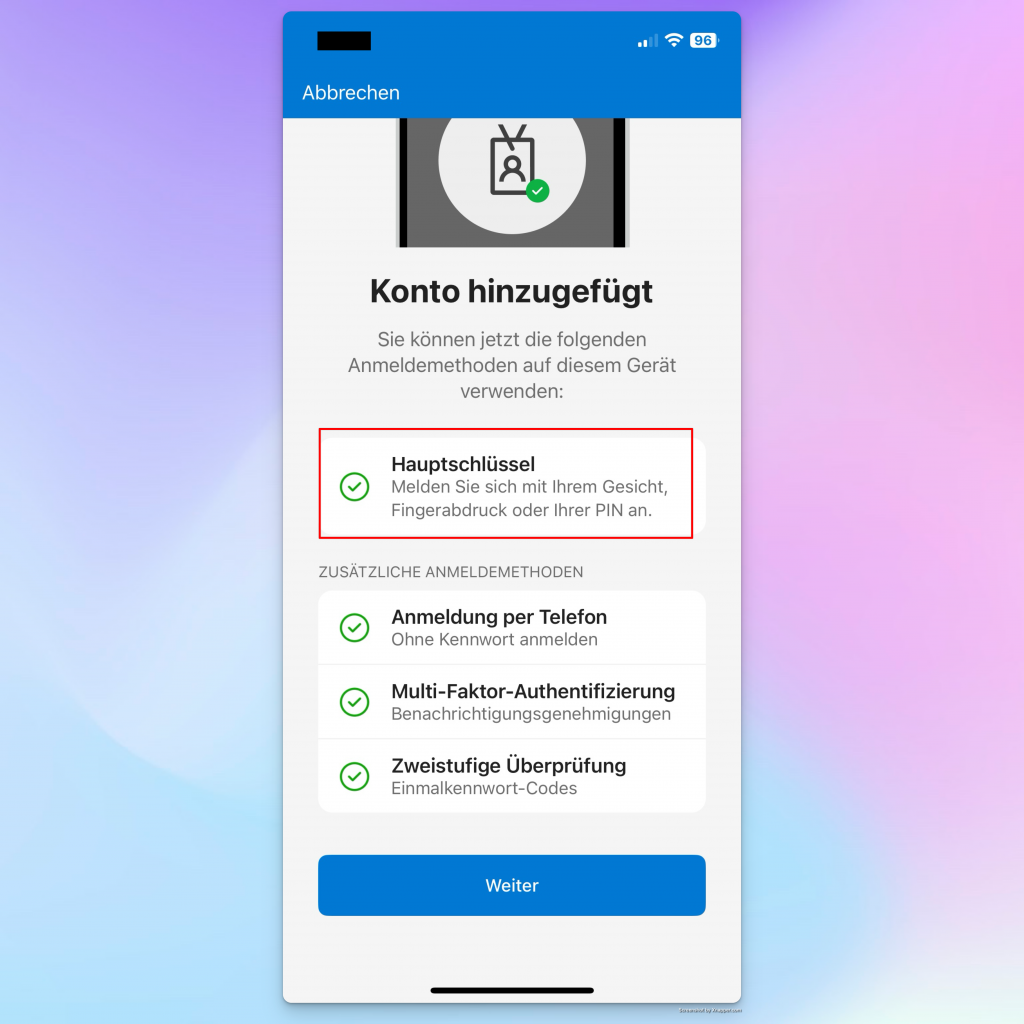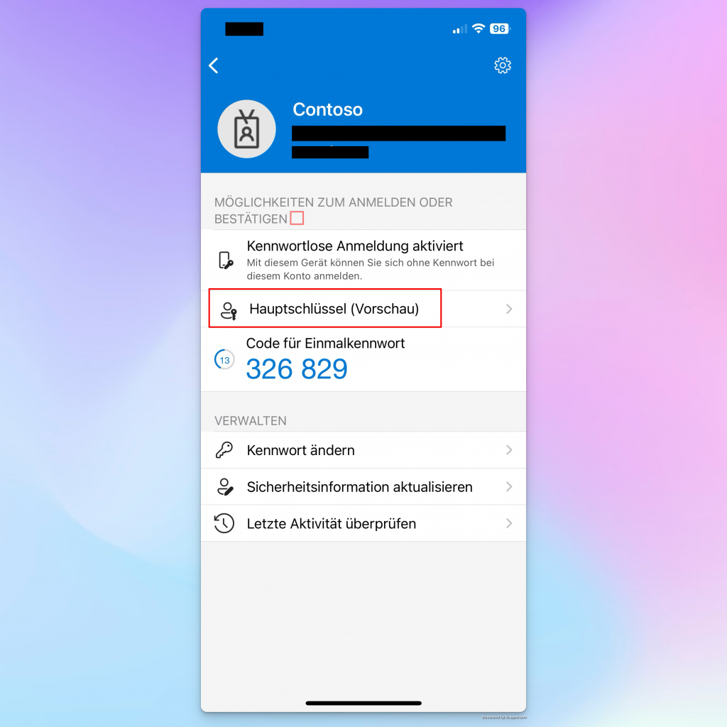 After checking the account in the Microsoft Authenticator app, I can see that the passkey (hash key) is activated: